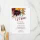 Os cartões de menu de outono são o sotaque perfeito para o seu casamento ou chá de panela de outono. A burlagem floresce e os girassóis brilhantes pop contra as folhas secas. Altere o texto, a cor da fonte e o estilo para personalizar o evento. Muitos tamanhos disponíveis.