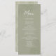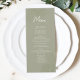 Um modelo de placa de menu de recepção de casamento minimalista simples. Este design apresenta um cartão de mesa de cardápio recepção de casamento, um destino de praia tropical botânica, uma folhagem de verde-ilha costeira, com cardápio de jantada de comer e beber, uma sopa de salada do curso principal, com um minimalista simples de sábio verde, um design moderno estilo contemporâneo, um roteiro de caligrafia de na moda, um estilo floral de boho criativo, um monograma personalizado