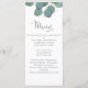 Belo cartão de cardápio de cerimônia de casamento do eucalipto com folhagem, com roteiro de caligrafia, verde-eucalipto simples e folhagem verde, perfeito para decoração de recepção de casamento