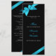 Fita turquesa de 4" x 9,25" em fundo preto. Modelo de cardápio de casamento elegante e totalmente personalizável.