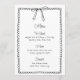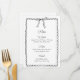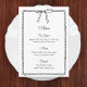 Adicione um toque de charme ao seu evento com este cartão de menu de laço preto e branco. Apresenta uma ilustração de laço desenhada à mão e uma moldura rendilhada para um visual lúdico e elegante. Ideal para casamentos, chá de panela ou festas de noivado com um visual minimalista e sofisticado. O texto personalizável facilita a coordenação com o seu tema. Funciona lindamente com decoração monocromática ou inspirada na França.