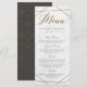 Crie seus próprios cartões de menu de casamento personalizados com modelos fáceis de usar da WowWed. Estes cartões de menu geométricos apresentam caligrafia dourada falsa, fundo de mármore branco e tipografia elegante. No verso, há um padrão geométrico dourado em um fundo cinza.