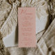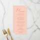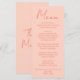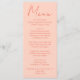Um cardápio de jantar de casamento colorido, moderno e funky em laranja rosa. Que apresenta um design de modelo sofisticado com fundo rosa vintage boho na frente e rosa no verso. Com tipografia caprichosa laranja. Perfeito e compatível com o conjunto todo.