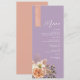 Defina um tom romântico para o seu casamento com este cardápio de casamento floral rústico com nomes personalizados dos convidados. Projetado com um fundo roxo suave, cabeçalho em letra cursiva elegante e uma faixa vertical exclusiva com nomes em pêssego, este cardápio adiciona um toque moderno e aconchegante à decoração da sua mesa. As flores em tons de rosa, pêssego, marfim e lavanda na parte inferior evocam o charme do final do verão ou início do outono - perfeito para casamentos rústicos chiques, boho garden ou no campo. O texto totalmente editável permite que você personalize cada prato e nome do convidado com facilidade.