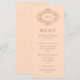 Este cartão de cardápio de casamento elegante apresenta um fundo rosa bege suave projetado com uma moldura ornamentada e vintage em dourado rosé falso. Suas iniciais e o restante do texto aparecem em uma cor rosa correspondente.