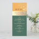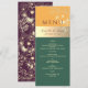 Simples, caligrafia, moderno, elegante, tons de joia, verde esmeralda, amarelo e roxo ameixa cardápio de casamento com renda floral dourada.