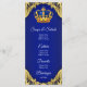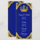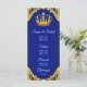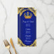 Cardápio de chá de bebê príncipe com bela coroa azul real e dourada em um elegante fundo de redemoinho azul real e dourado. Estes cardápios de chá de bebê príncipe azul real e dourado são facilmente personalizados para o seu evento, basta adicionar seus detalhes no estilo de fonte e layout que preferir.