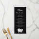 Um cardápio para casamentos, celebrações ou restaurantes com um design simples apresentando um conjunto de talheres em um lindo guardanapo de mesa branco adornado em tons de cinza e preto. Personalize para alterar as fontes, cores de fundo e até salve seu design para mais tarde.
