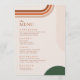 Cartões de menu modernos boho com formas de arco. A cor principal do cartão de menu é bege, com formas de arco em verde escuro, ferrugem e cores terracota. Seguindo as tendências modernas, este menu certamente será um detalhe marcante na mesa.