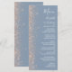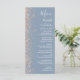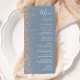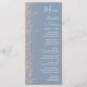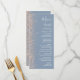 A borda esquerda deste elegante cardápio moderno de casamento apresenta um design de brilho de pêssego. O texto personalizável combina manuscrito branco, fontes em copperplate e itálico em um fundo azul empoeirado. O verso apresenta um design de brilho azul empoeirado e cor de pêssego.