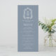 Este elegante design de cardápio de casamento inspirado em vintage apresenta um par de iniciais de monograma branco em letra serif aberta acima e abaixo de uma linha divisória e rodeado por uma crista botânica de arte em uma camada azul empoeirada. A parte traseira da placa é azul empoeirado sólido.