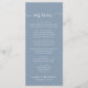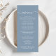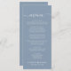 Menu azul empoeirado moderno para sua recepção de casamento, festa de noivado, janto de ensaio e outras comemorações de casamento com "menu" em um roteiro de caligrafia branca com baloiços, seu menu personalizado em tipografia branca simples, seus primeiros nomes unidos por um coração e sua data de evento.