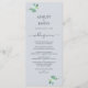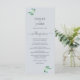 Elegante menu de casamento simples com caligrafia chic escrita com letra azul escura e um toque na moda de folhagem verde de eucalipto sobre fundo azul pastel. Basta adicionar os detalhes do seu casamento. Desenvolvido exclusivamente para você pelo Happy Dolphin Studio. Se tiver perguntas ou pedidos, contacte-nos em happydolphinstudio@outlook.com. Estamos felizes em ajudá-lo a fazer seu casamento o dia mais bonito!