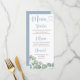 Seus convidados adorarão este cartão de menu azul de coordenação empoeirado. Apresenta uma folhagem verde de sábio rústico em aquarela, sobre fundo branco com caligrafia azul e cinza empoeirada. Faça deste item único parte do seu papel de carta de casamento.