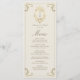Elegante cartão de menu de casamento vintage com moldura barroca em ouro ornamentado e design de monograma clássico. Impresso em fundo creme, este menu atemporal destaca cada prato em um layout sofisticado. Perfeito para casamentos formais, luxuosos ou inspirados na era vitoriana.