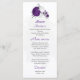 Romântica, roxo real e flores brancas com cartão de cardápio botânico de folhas prateadas. Os detalhes de brilho são simulados.