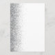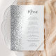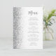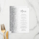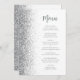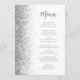 A borda esquerda deste elegante cardápio moderno de casamento apresenta uma falsa borda cintilante prateada. O texto personalizável combina o script de escrita manual de cinzas e o tipo de letra sans serif num fundo branco. O verso apresenta um design de brilho branco e prateado.
