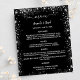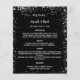 Por favor, note que este menu está no papel folheto e muito fino. Para menus mais espessos (mesmo design) visite nossa loja. Um elegante e glamouroso menu de casamento. Um fundo preto, decorado com falso brilho prateado, faíscas. Texto branco. Personalize e adicione seu nome, datas e o menu. Você pode adicionar mais texto, fotos no verso.