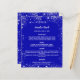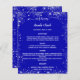 Um clássico cardápio de casamento. Um fundo azul real. Texto branco. Decorado com falso brilho prateado, faíscas. Personalize e adicione seu nome, data e menu. Você pode adicionar mais texto, fotos no verso. 1 folha = 1 menu impresso borda a borda.