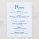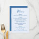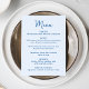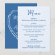 Compartilhe o cardápio da sua recepção com estilo com este cartão de menu de casamento caprichoso, projetado para combinar com papelaria de casamento moderna e divertida. A frente do cardápio apresenta “Menu” exibido em uma escrita azul à mão com os detalhes do cardápio de casamento mostrados abaixo em um fundo azul claro, criando um visual fresco e alegre para as mesas da recepção. A parte de trás do cartão de menu de casamento exibe um coração azul claro desenhado à mão em torno dos nomes do casal e da data do casamento, adicionando um detalhe doce e coeso. Perfeito para casais que planejam uma celebração divertida e romântica, este cardápio de recepção de casamento personalizável adiciona cor e personalidade, mantendo as opções do cardápio fáceis de ler para os convidados.