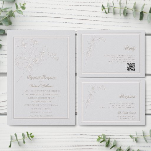 Um galho de orquídeas brancas, desenhadas à mão na tinta da China e colocadas digitalmente em camadas com um falso efeito emboscado, juntamente com uma dupla trama em camadas com o mesmo falso efeito emboscado, decoram esta elegante e sofisticada peça companheira de convite formal: o cartaz cardápio, que apresenta uma caligrafia elegante com floreados delicados. Esse cartão de cardápio clássico e moderno emboscado é perfeito para casais que preferem artigos tradicionais formais de casamento e que amam o efeito gravado.