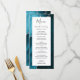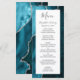 Este elegante e moderno menu de casamento mostra uma cor d'água azul verde agata de fundo com brilho de prata. O texto aparece na escrita elegante de cinzas de carvão vegetal e sans serif fonts em um retângulo branco. O design de ágata é repetido no reverso.