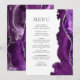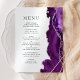 A borda direita deste elegante menu de casamento moderno apresenta uma cor d'água púrpura e borda agitada com falso brilho prateado. O texto personalizável combina as fontes de serif romana e copperplate de cinza de carvão em um fundo branco. O verso apresenta um design de agata prateado e roxo correspondente.