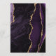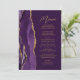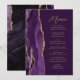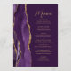 Este elegante cardápio moderno de casamento apresenta uma cor d'água púrpura e borda agitada com brilho de ouro falso. O texto personalizável combina o script de escrita manual dourado e as fontes sans serif em um fundo de ameixa. O design de agata roxo e dourado é repetido no verso.