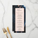 Este elegante e moderno menu de casamento mostra um marinho azul de aquarela com fundo azul de agata, aparado com brilho de ouro rosa. O texto aparece em letras elegantes de cinza de carvão vegetal e fontes de impressão em um retângulo cor-de-rosa pincelado. O design de ágata é repetido no reverso.