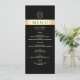 Adicione um toque sofisticado à mesa do seu casamento com este cardápio de luxo preto e dourado, apresentando um monograma moderno no topo e tipografia elegante em todo o material. O fundo preto formal, combinado com uma faixa dourada falsa brilhante, cria um visual sofisticado e atemporal — perfeito para recepções de casamento sofisticadas, glamorosas ou formais. Totalmente personalizável para refletir a data do seu casamento, iniciais e seleções exclusivas de jantar.