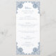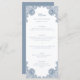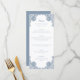 Elegante cardápio de casamento azul empoeirado com um lugar floral azul empoeirado. Itens correspondentes disponíveis. Personalize facilmente este cardápio de casamento azul empoeirado com seus detalhes de casamento.