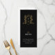 Menu janto de casamento preto, dourado e branco. Edite este menu de 4 cursos com o seu próprio texto de opção de refeição. A crista monográfica formada, mas moderna, com as bagas e folhas entrelaçadas, foi arrancada com uma design da coroa cardíaca, preta, branca e dourada. © Desenho manual original e design por Sarah Trett para www.mylittleedenweddings.com exclusivamente em zazzle.