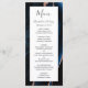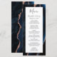 Este elegante e moderno menu de casamento mostra um marinho azul de aquarela com fundo azul de agata, aparado com brilho de ouro rosa. O texto aparece em letras elegantes de cinza de carvão vegetal e fontes de impressão em um retângulo branco. O design de ágata é repetido no reverso.