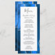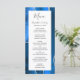 Este elegante e moderno menu de casamento mostra uma cor-d-água azul real sobre o fundo, aparado com brilho de prata. O texto aparece em letras elegantes de cinza de carvão vegetal e fontes de impressão em um retângulo branco. O design de ágata é repetido no reverso.