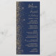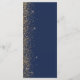 A borda esquerda deste elegante cardápio moderno de casamento apresenta um design de brilho dourado. O texto personalizável combina uma letra pálida de cor dourada, uma letra copperplate e uma letra itálico num fundo azul marinho. O verso apresenta um design brilhante marinho azul e dourado.
