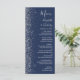 A borda esquerda deste elegante cardápio moderno de casamento apresenta um design de cintilação. O texto personalizável combina a escrita manual de cinzas prateadas, fontes copperplate e itálico em um fundo azul marinho. O verso apresenta um design brilhante marinho azul e prateado correspondente.