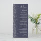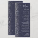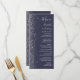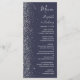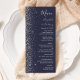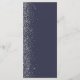 A borda esquerda deste elegante cardápio moderno de casamento apresenta um design de cintilação. O texto personalizável combina a escrita manual de cinzas prateadas, fontes copperplate e itálico em um fundo azul escuro de marinho. O verso apresenta um design brilhante azul escuro e prateado.
