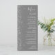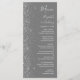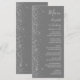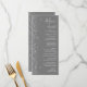 A borda esquerda deste elegante cardápio moderno de casamento apresenta um design de cintilação. O texto personalizável combina a escrita manual de cinzas prateadas, fontes copperplate e itálico em um fundo de cinza. O verso apresenta uma cinza e um design cintilante prateado.
