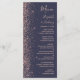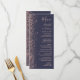 A borda esquerda deste elegante cardápio moderno de casamento apresenta um rosa dourado faux glitter design. O texto personalizável combina a letra rosa-rosa pálida, a letra copperplate e a letra itálica num fundo azul escuro. O lado inverso apresenta um design brilhante rosa e azul escuro correspondente.