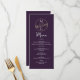 Menu de casamento simples, moderno, minimalista, elegante e roxo escuro com monograma gigante - iniciais no topo, desenhadas à mão de aves de casal de ouro e roteiro de caligrafia.