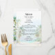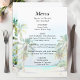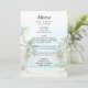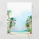 Este elegante e belo cardápio de casamentos de aquarelas mostra uma praia, céu azul e palmeiras. O texto combina o script manuscrito e as fontes sans serif para uma aparência na moda e moderna. Isto é perfeito para uma praia de verão ou um casamento de destino tropical.