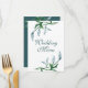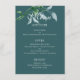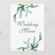 Uma placa de menu de Recepção de casamento floral, com ramificações de aquarelas em tons de verde azul, em um fundo branco. O inverso inclui o Texto do Menu cheio em um plano de fundo azul-esverdeado com texto branco. Para personalizar este cartão, basta inserir os itens de seleção de menu no nosso modelo passo a passo. Certifique-se de ver toda a Coleção de Casamentos Florais Verdes Azuis de Aquarela.