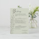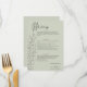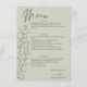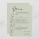 Um cartão de cardápio de eterno que contém roteiros de eucalipto desenhados à mão sobre um fundo verde leve. O script elegante e as fontes de servidor clássicas se combinam para realçar os detalhes do menu e os nomes do casal. Perfeito para casamentos inspirados na natureza ou minimalistas com um toque romântico.