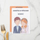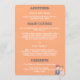 Este belo cardápio de casamento mostra uma charmosa noiva e noiva. O noivo é representado por cabelo castanho curto, uma cor clara, e está vestindo uma jaqueta de terno azul marinho sobre uma camisa azul clara colada e uma gravata branca. Ele tem um pequeno butonniere preso à sua lapela. A noiva está ao seu lado, sorrindo doce. Ela tem cabelos ondulados, cor de laranja avermelhada adornados com uma coroa floral de cor rosa, laranja e flores brancas. Um delicado véu branco corre atrás dela. Ela está vestindo um vestido branco de casamento com uma linha de pescoço e um colar de pérolas. Esta ilustração simples, parecida com cartoon sugere uma ligação amorosa entre eles. É caprichoso e carinhoso, dando um tom alegre para o próximo casamento. O menu no verso, em um plano de fundo laranja é separado em três seções com títulos e conteúdo personalizáveis, você pode modificar, remover ou adicionar mais seções se desejar.