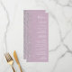 A borda esquerda deste elegante cardápio moderno de casamento apresenta um design de cintilação. O texto personalizável combina manuscrito branco, fontes em copperplate e itálico em um fundo roxo empoeirado de lavanda. O verso apresenta uma lavanda empoeirada e design brilhante prateada.