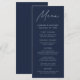 Elevem sua recepção de casamento com nosso belo cardápio de casamento, apresentando um roteiro branco manuscrito e elegante em um fundo de marinho. Perfeito para casais que buscam um olhar simples, mas sofisticado, este design moderno permite personalizar com seus nomes, data de casamento e ofertas de menus. Seu estilo minimalista complementa sem esforço qualquer tema de casamento, adicionando um toque de elegância ao seu dia especial. Faça uma impressão duradoura em seus convidados com um menu que reflita a simplicidade quica de sua visão de casamento.