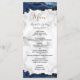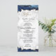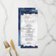 Este elegante e moderno menu de casamento apresenta bordas de cima e de baixo da marinho azul de aquarela, cortada com brilho dourado. O texto aparece em um guião elegante e dourado de escrita manual e fontes itálicas e em prato preto em uma cinza e fundo de mármore branco. O design de ágata é repetido no reverso.