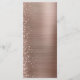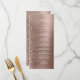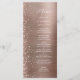 Este elegante cardápio moderno de casamento apresenta uma falsa borda brilhante de diamante em um fundo de metal esfregado em ouro rosa. O texto personalizável combina o script branco de escrita manual e as fontes sans serif. O rosa dourado, o metal escovado e o design reluzente, são repetidos no verso.