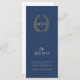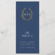 Janto de casamento azul-escuro, branco e dourado. Edite este menu de 4 cursos com o seu próprio texto de opção de refeição. Folhas ovais e design de monograma desenhadas à mão modernas, mas clássicas. © Original desenho de mão oval e design por Sarah Trett para www.mylittleedenweddings.com exclusivamente em zazzle.