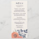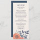 Coloque estas placas de menu elegantes em cada lugar, para obter um belo toque na configuração da recepção de casamento. Design floral moderno em um coral chico e paleta de cores de marinho apresenta flores de papoila de aquarela em pêssego de coral, com folhas e botões em azul-marinho empoeirado e verde-caçador desbotado. Adicione seus nomes e data de casamento ao topo. Coordena-se com nossa coleção de convites de casamento de Peach Poppies. Use os campos modelo para adicionar as informações do menu e clique em "Personalizar" para reposicionar os elementos, se necessário. Precisa de ajuda? Entre em contato comigo através do link "Perguntar a este Designer" nesta página.